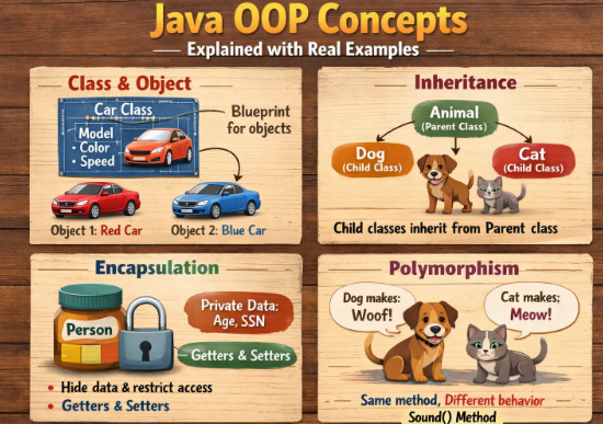 Java Object-Oriented Programming concepts are the foundation of professional Java development. Encapsulation protects data, inheritance promotes reuse, polymorphism enables flexibility, and abstraction hides complexity.